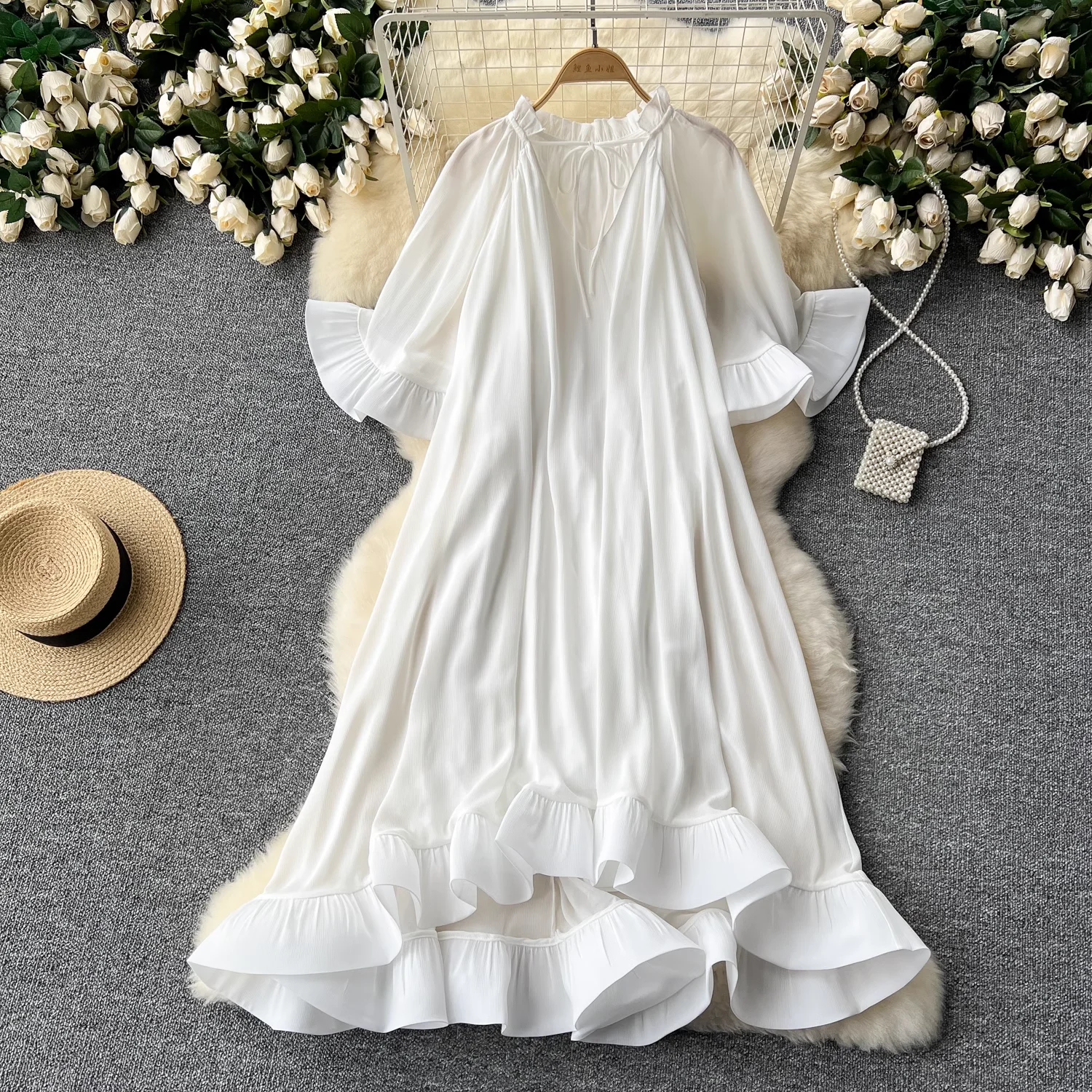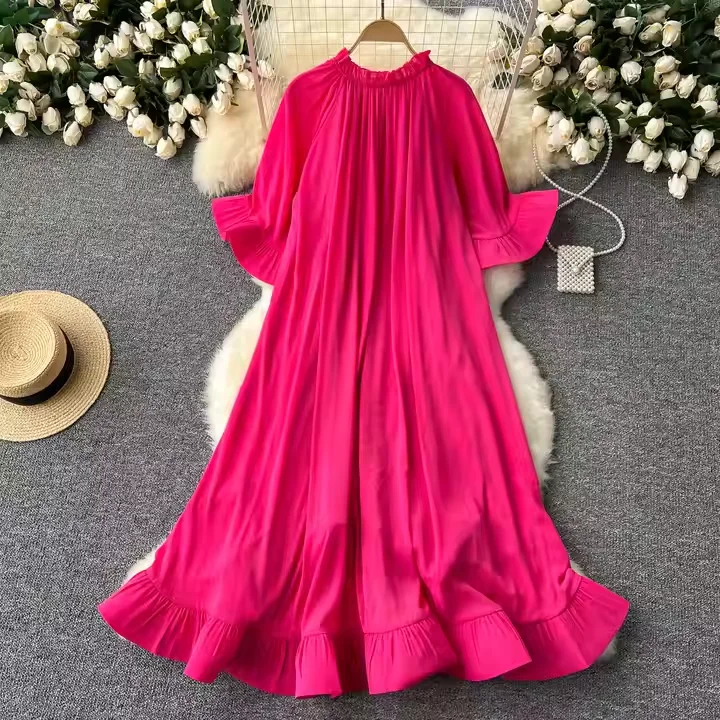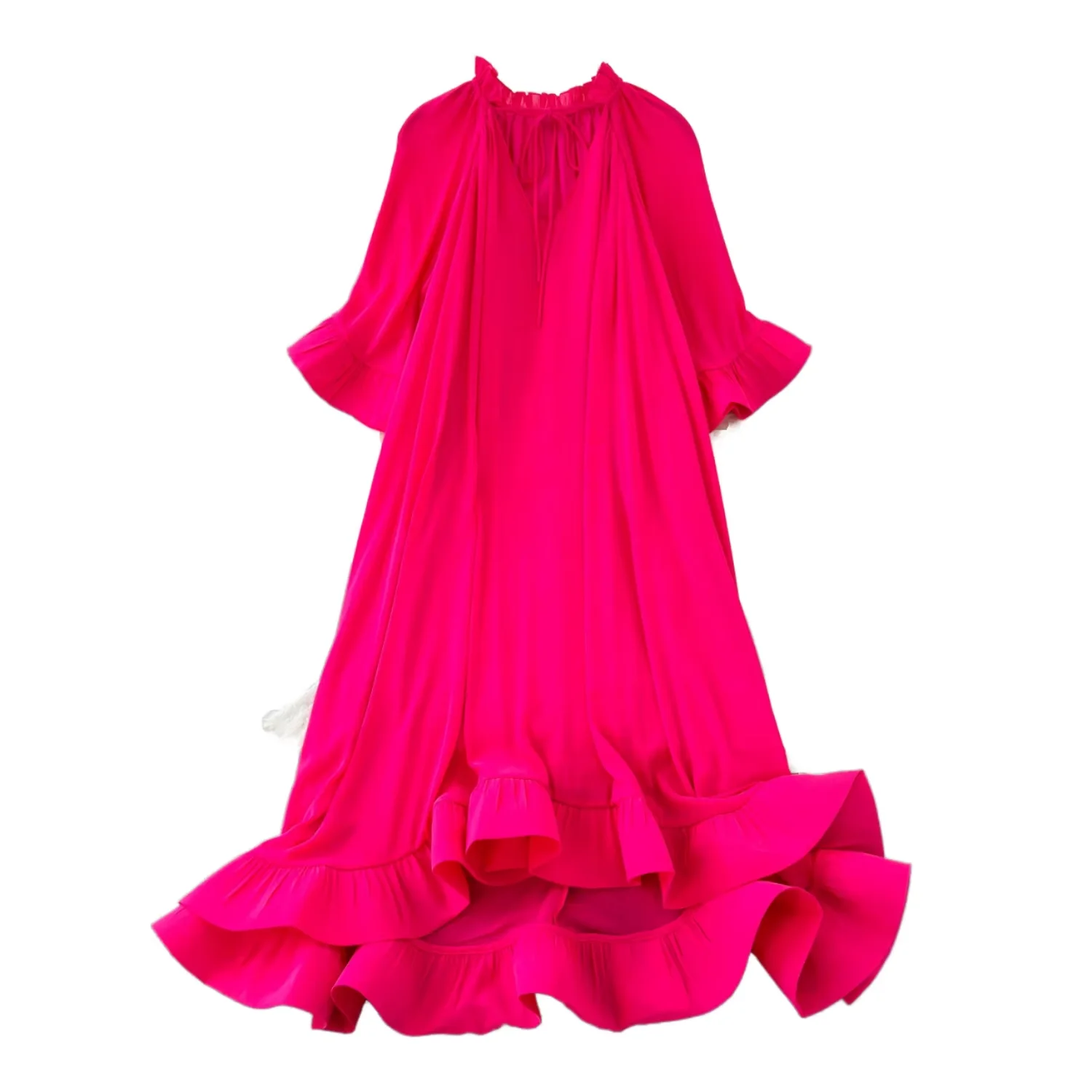 Luxurious Retro High-End Elegant LIng Casual Dress V-Neck Tie-Up Pleated Puffed Mid-Sleeve Ruffled Summer Midi Solid Natural